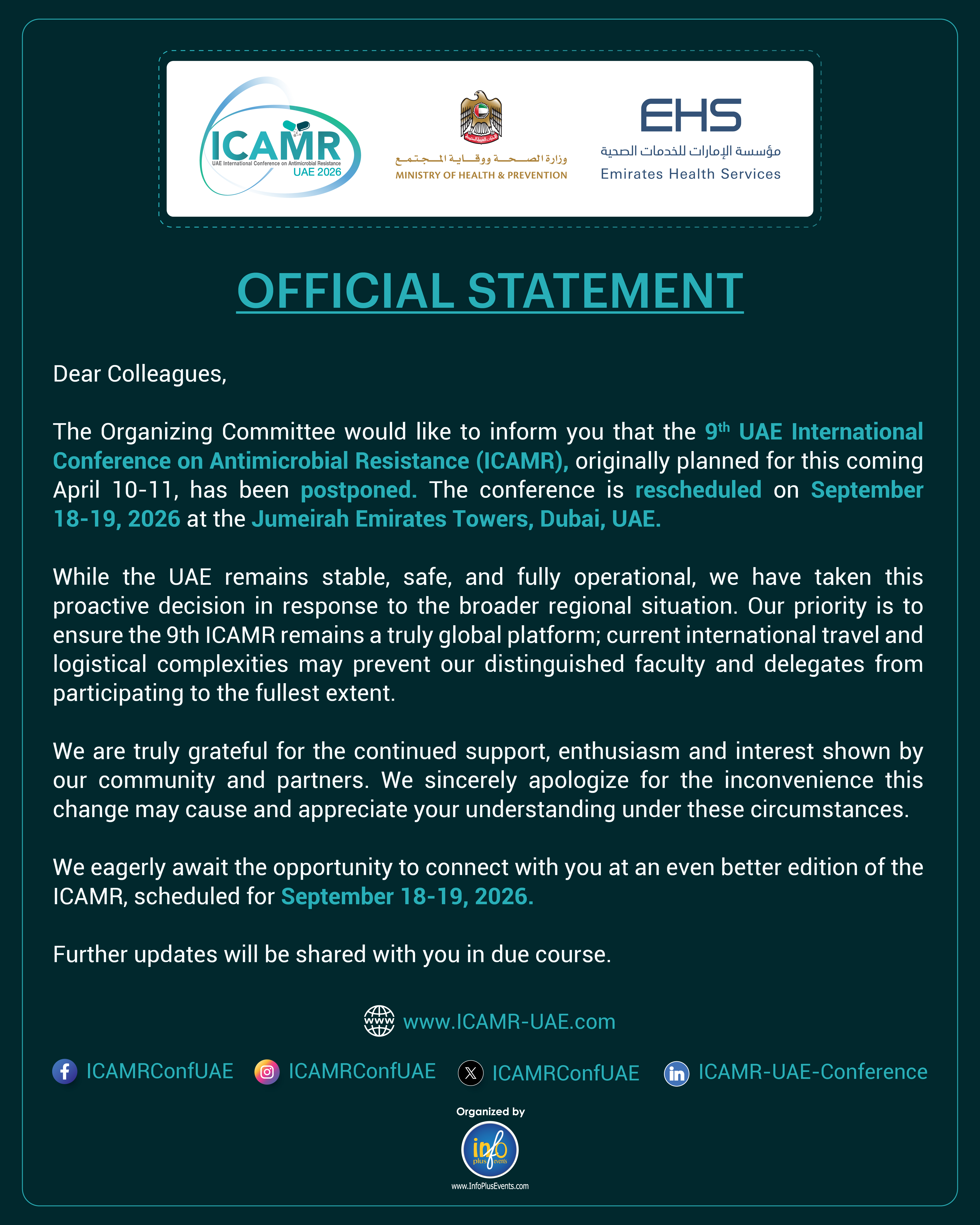 It is my great pleasure to invite you to the 9th UAE International Conference on Antimicrobial Resistance (ICAMR 2026), which will take place on 10 & 11 April 2026, at the prestigious Jumeirah Emirates Towers, Dubai, United Arab Emirates.